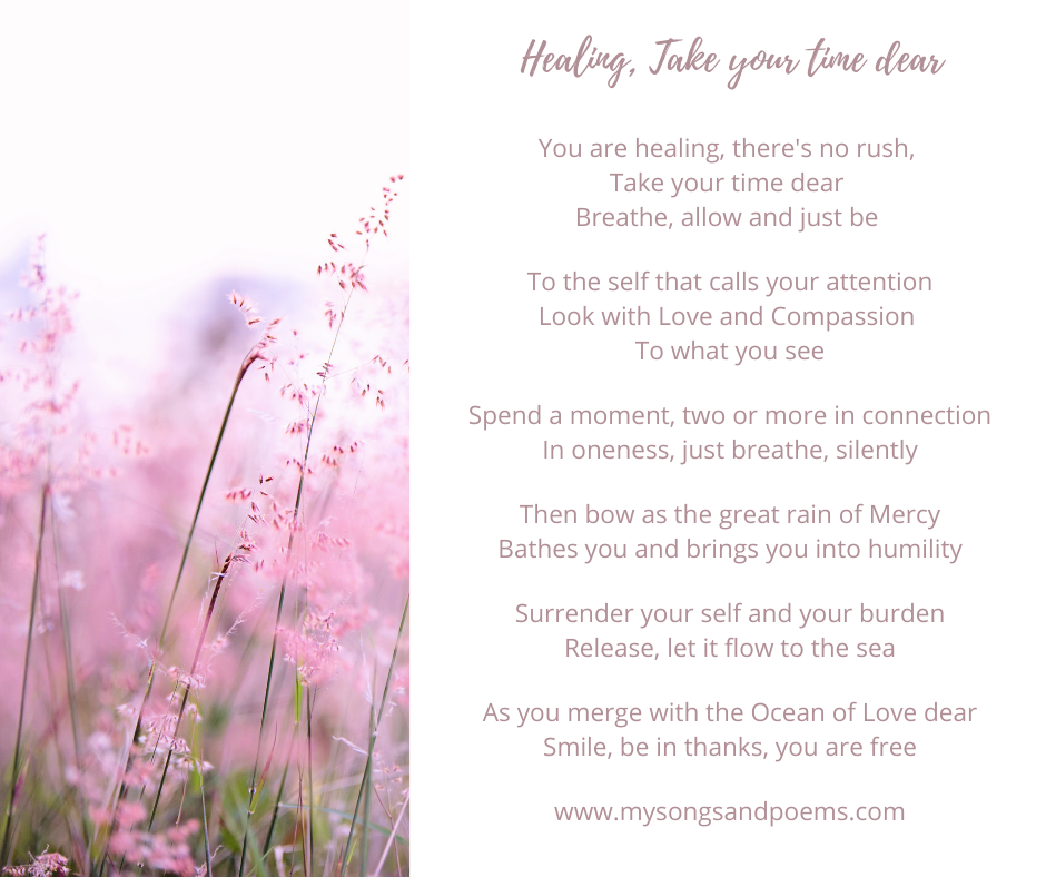 Healing, Take Your Time Dear You are healing, there's no rush, Take your time dear Breathe, allow and just be To the self that calls your attention Look with Love and Compassion To what you see Spend a moment, two or more in connection In oneness, just breathe, silently Then bow as the great rain of Mercy Bathes you and brings you into humility Surrender your self and your burden Release, let it flow to the sea As you merge with the Ocean of Love dear Smile, be in thanks, you are free Sandra Hillawi 22 July 2021 Listen Here