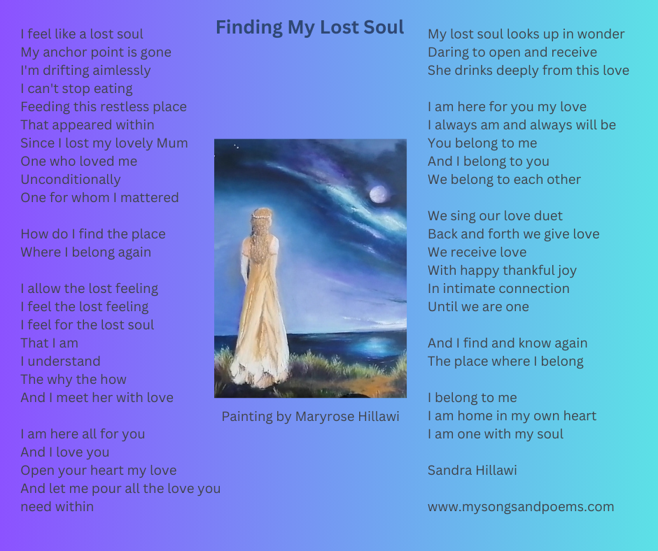 I feel like a lost soul My anchor point is gone I'm drifting aimlessly I can't stop eating Feeding this restless place That appeared within Since I lost my lovely Mum One who loved me unconditionally One for whom I mattered